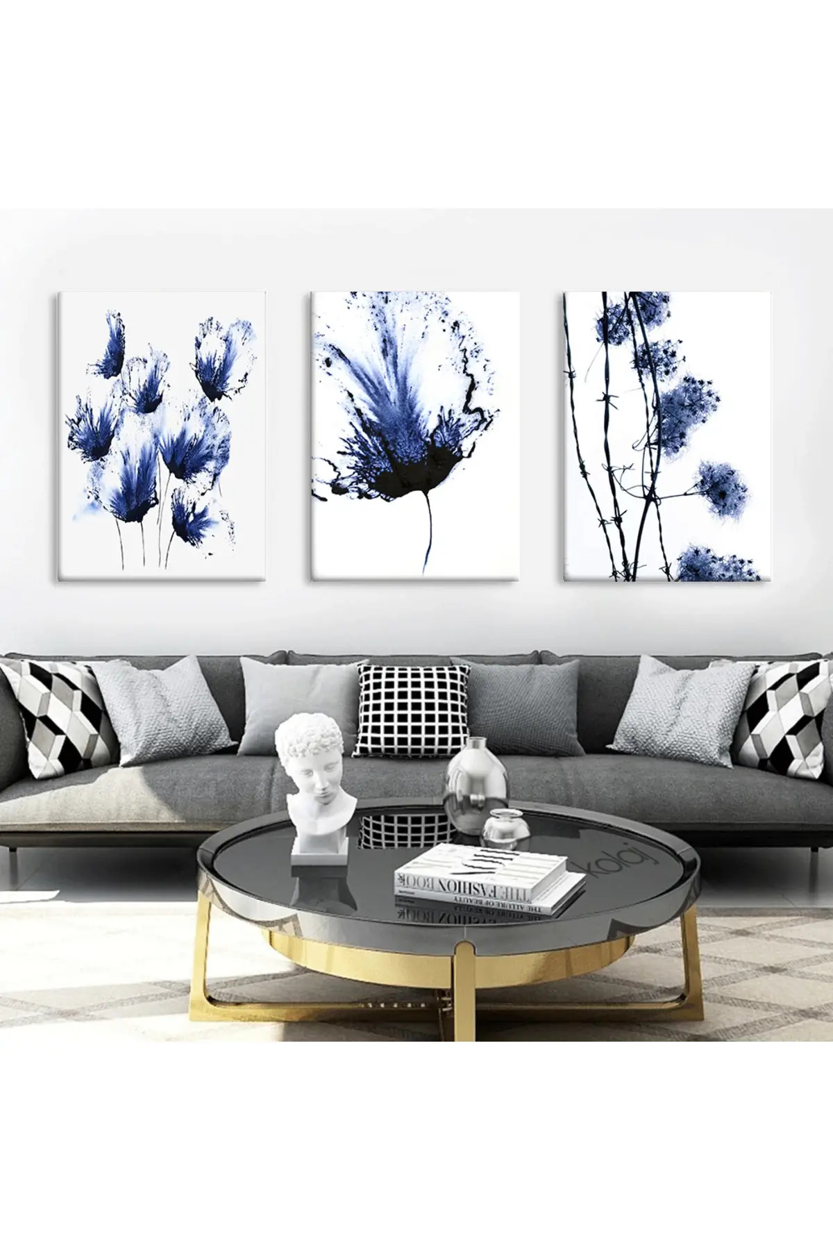 Suluboya Dokulu Mavi Çiçekler Dekoratif 3'lü Kanvas Tablo Seti Hakkında