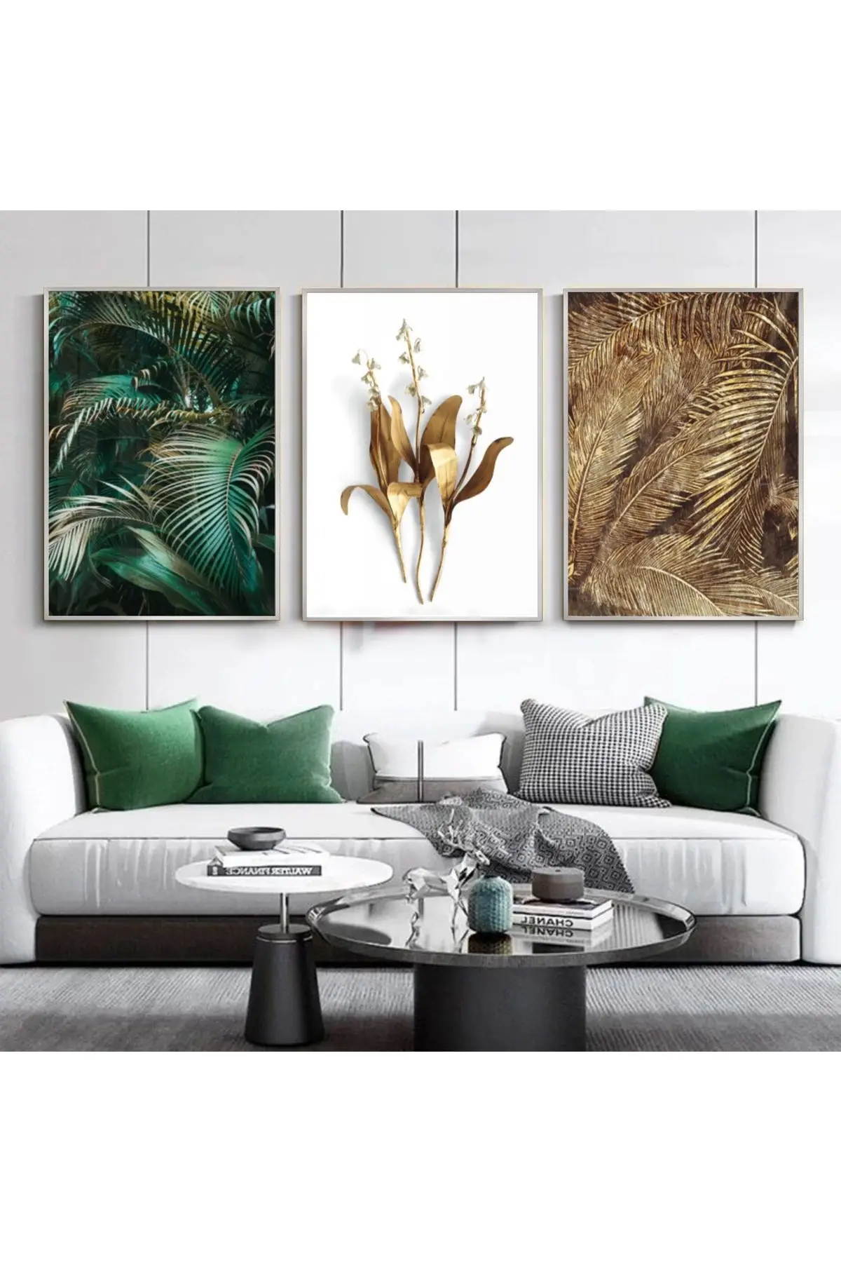 Tropik Yapraklar Ve Altın Dokunuşlar Metal Çerçeveli Tablo Seti Hakkında
