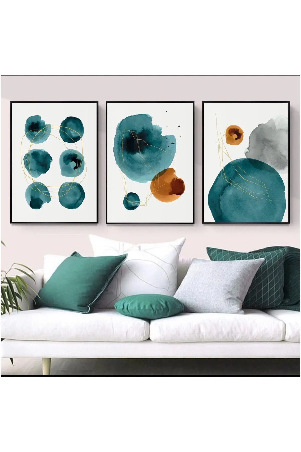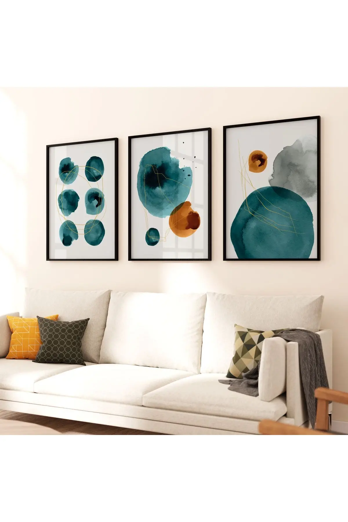 Turkuaz Dönüşüm: Soyut Daireler Üçlü Metal Çerçeveli Tablo Seti Hakkında