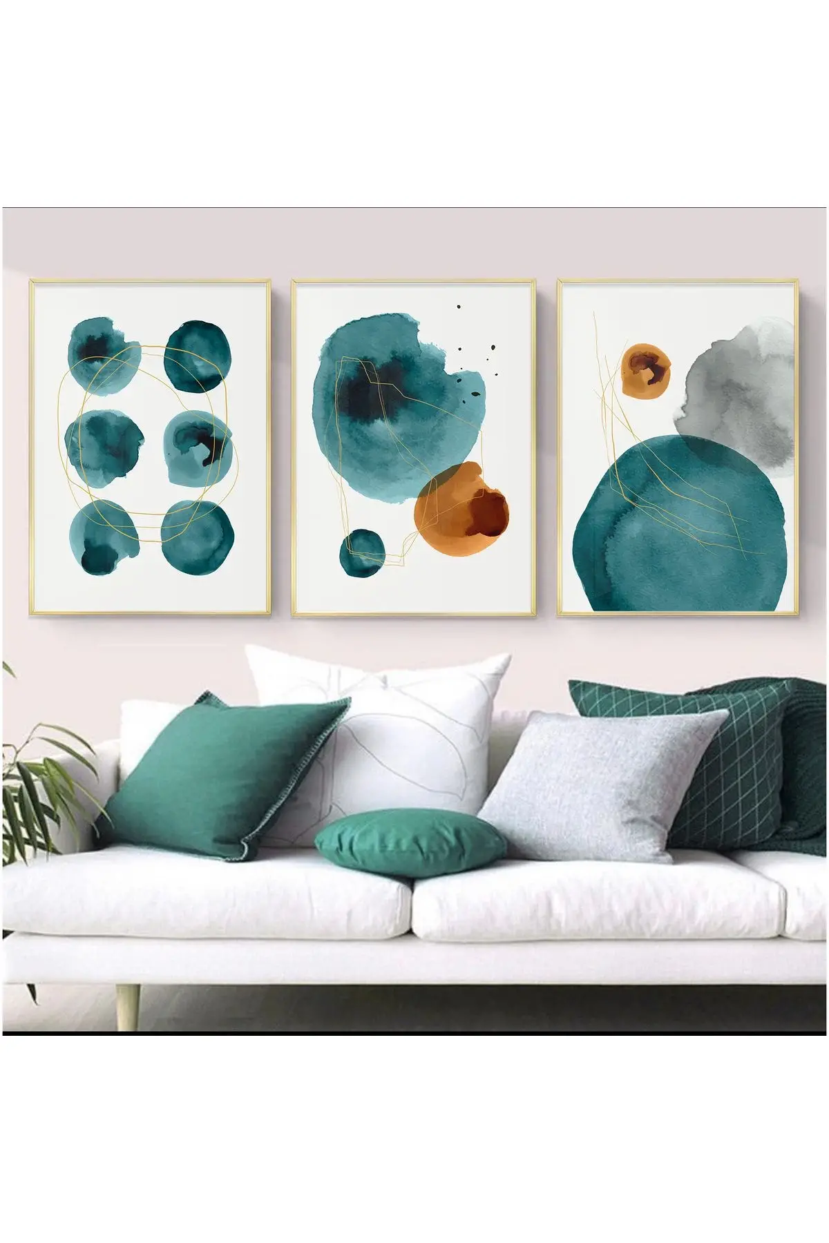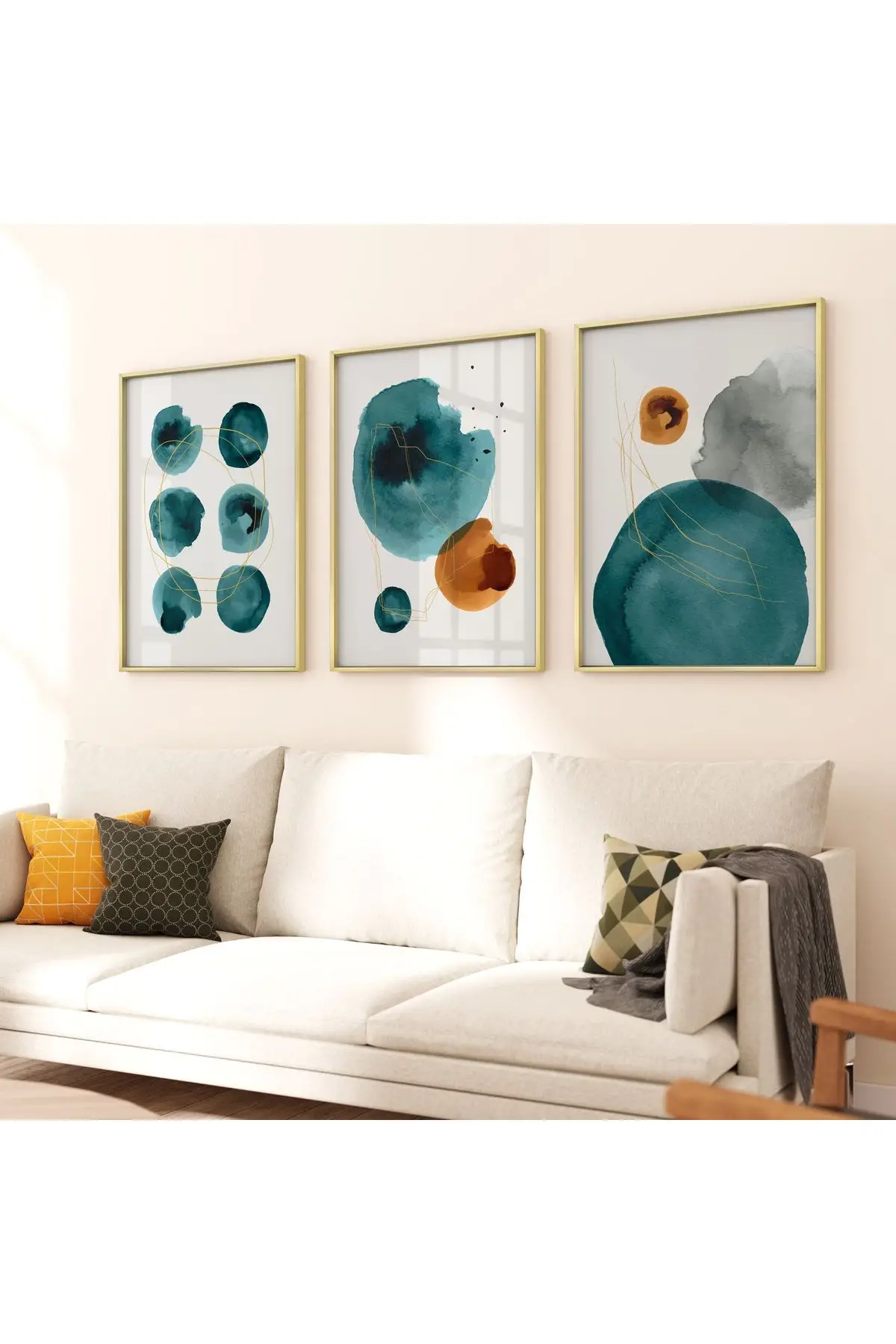 Modern ve rahat bir oturma odasının üstünde asılı bu üçlü tablo seti, koyu turkuaz renkli daireler ve kahverengi çizgilerle soyut bir güzellik sunar. %100 alüminyum metal çerçeve ve gerçek kırılmaz cam, bu sanat eserlerini uzun süre koruyacak ve sergileyecektir.