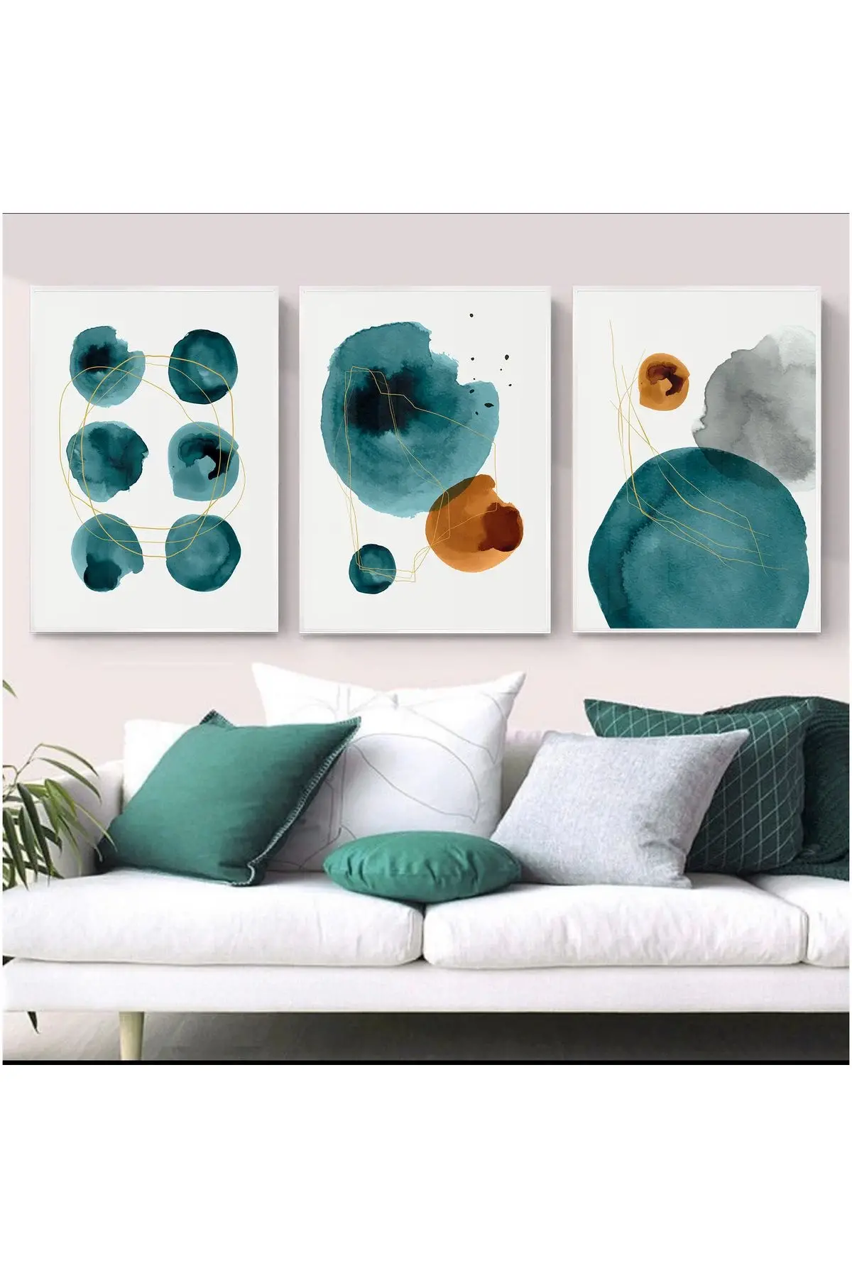 Modern ve rahat bir oturma odasının üstünde asılı bu üçlü tablo seti, koyu turkuaz renkli daireler ve kahverengi çizgilerle soyut bir güzellik sunar. %100 alüminyum metal çerçeve ve gerçek kırılmaz cam, bu sanat eserlerini uzun süre koruyacak ve sergileyecektir.