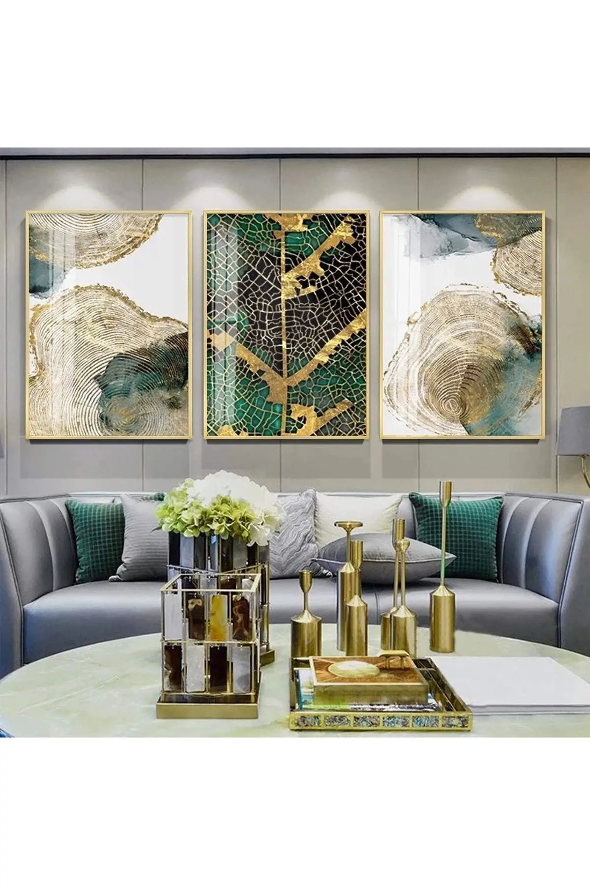 Yeşil Ve Altının Büyüleyici Dansı: Mermer Dokulu Üçlü Metal Çerçeveli Tablo Seti Hakkında