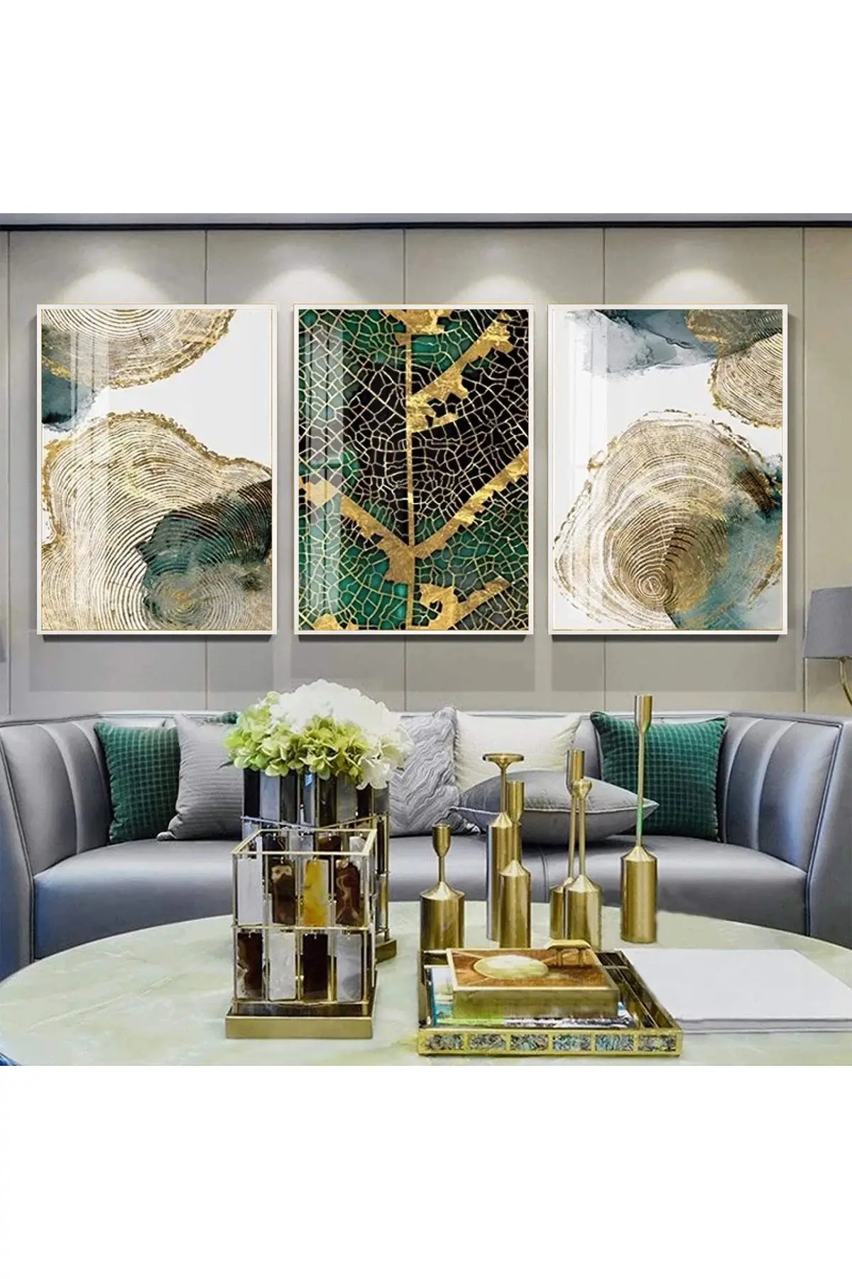 Yeşil Ve Altının Büyüleyici Dansı: Mermer Dokulu Üçlü Metal Çerçeveli Tablo Seti Hakkında