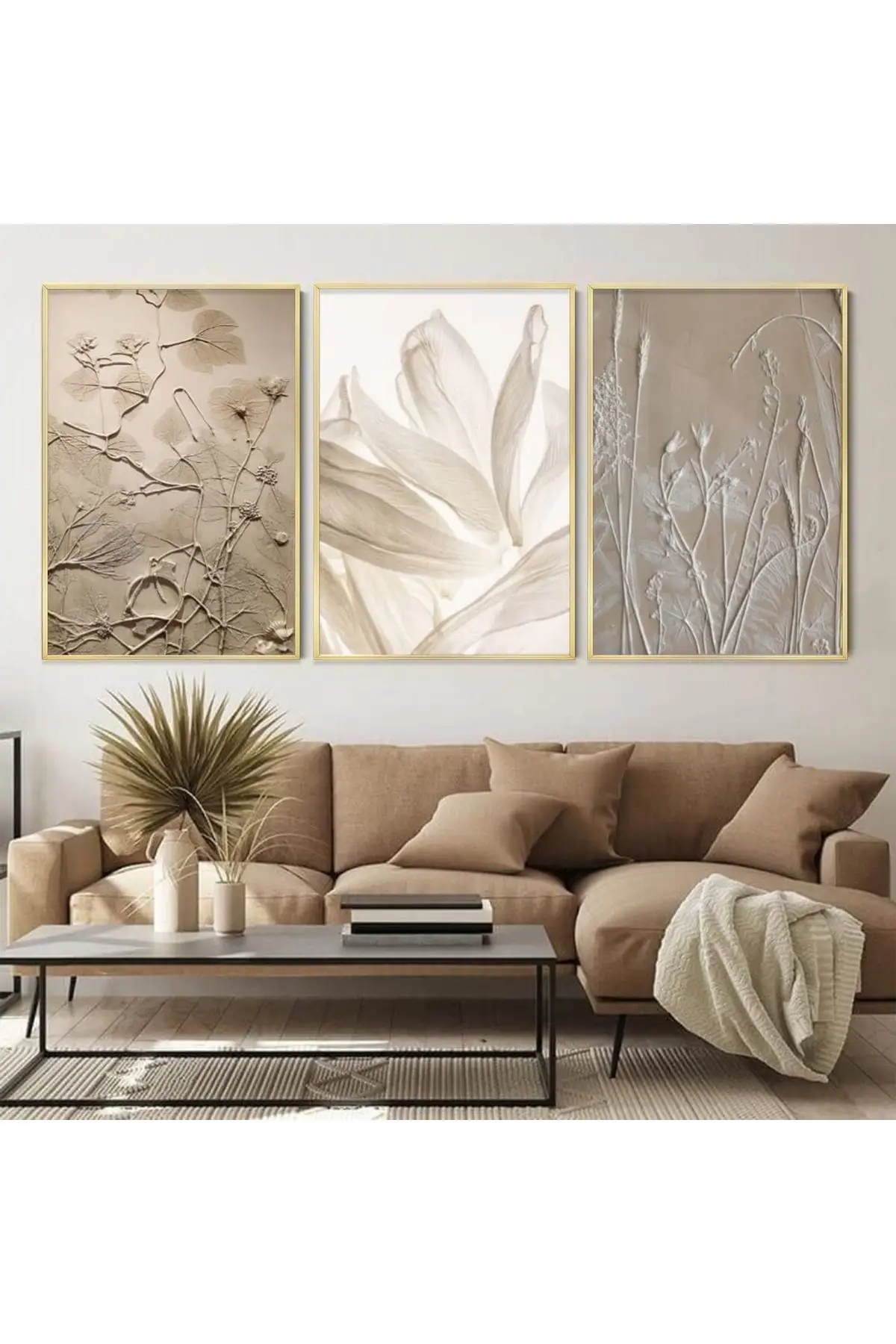 Zarif Natürel Izler Kabartma Efektli Üçlü Metal Çerçeveli Tablo Seti Hakkında